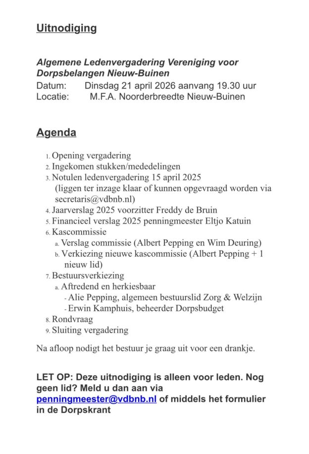 Komt u er niet uit, dan zullen wij als bestuur van vereniging voor Dorpsbelangen Nieuw-Buinen proberen de problemen en zaken aangaande ons dorp bespreekbaar te maken bij de betreffende instanties.